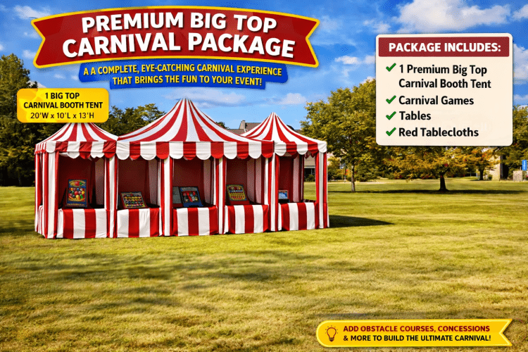 Create a true carnival experience with our eye-catching Big Top Carnival Booth Tent Package, perfect for school events, corporate events, birthday parties, church festivals, and fundraisers.