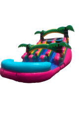 Get ready for a splash-tastic experience with the 15ft Dual Lane Malibu Waterslide! Bursting with vibrant tropical colors and palm tree accents, this inflatable slide brings island vibes and high-energy fun to any event. With two side-by-side lanes, kids and teens can race each other to the bottom for non-stop thrills and a refreshing splash landing.