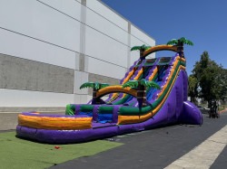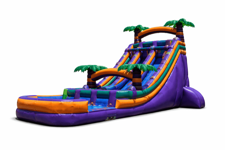 Make a splash with our brand new 22ft Purple Crush Dual Lane Waterslide — one of the tallest and most exciting slides in our inventory! This eye-catching inflatable features a vibrant purple and tropical theme that brings serious island vibes to any event. With two side-by-side lanes, kids and adults can race to the bottom and make a big splash together, making it perfect for birthdays, school events, or summer parties. The height adds thrill, the dual lanes add fun, and the bold colors add instant wow factor. Beat the heat and impress your guests with this unforgettable waterslide experience!