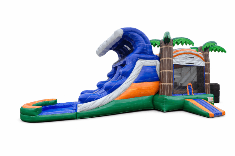 Prepare for a splash of excitement with the 27ft Tropical Wave Combo WET! This towering inflatable brings the thrill of a tropical paradise to your event. With a dual lane slide ending in a refreshing splash zone, it's perfect for keeping kids cool and entertained. The bright colors and palm tree design make it feel like your very own island escape. Trust us, this combo will be the centerpiece of any party, offering hours of fun in the sun!